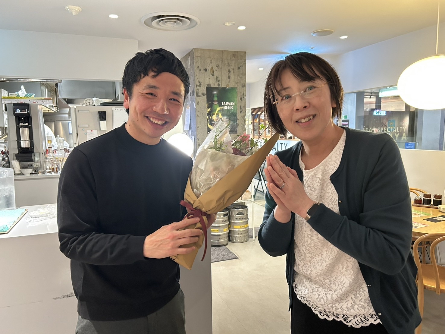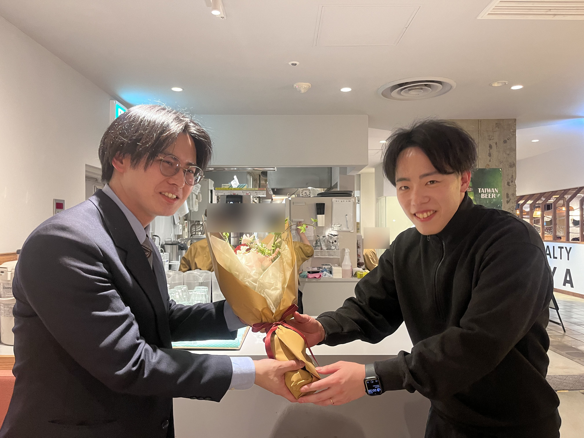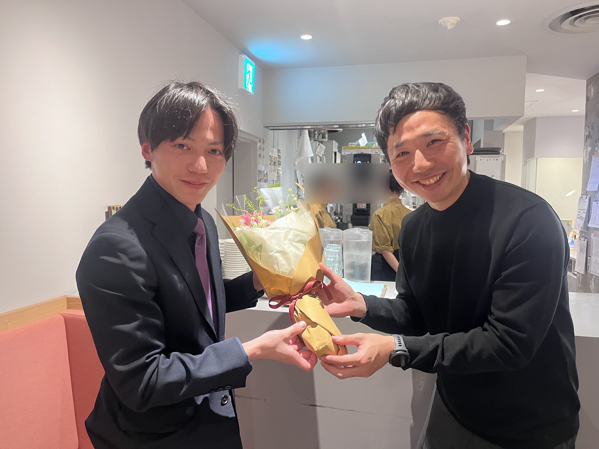 花束を贈呈したのは学生時代からの友人であるD2阿部さん。